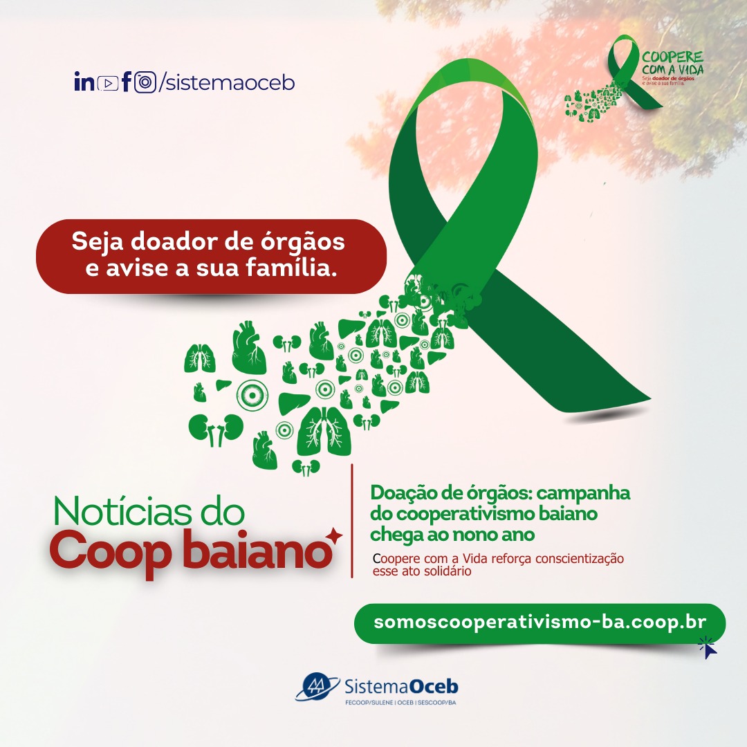 🫁🫀 O mês de setembro chegou e com ele, iniciamos a campanha Coopere com a Vida – Seja doador de órgãos e avise a sua família, que chega ao seu nono ano reafirmando o compromisso do cooperativismo baiano com uma causa que salva vidas: a doação de órgãos. O Sistema Oceb convida todas as coops na Bahia a participarem com ações de mobilização da população baiana, com o objetivo de estimular a sociedade a dizer "sim" para a doação.